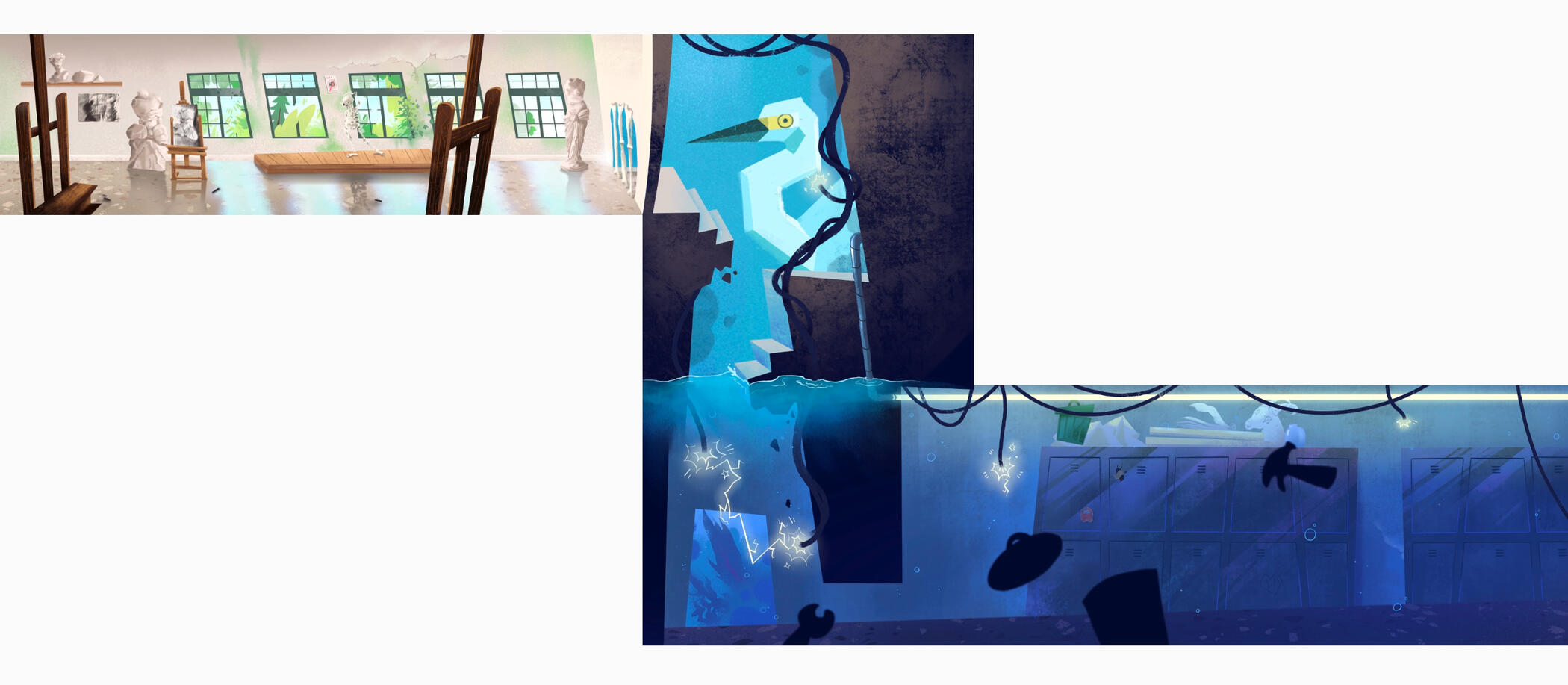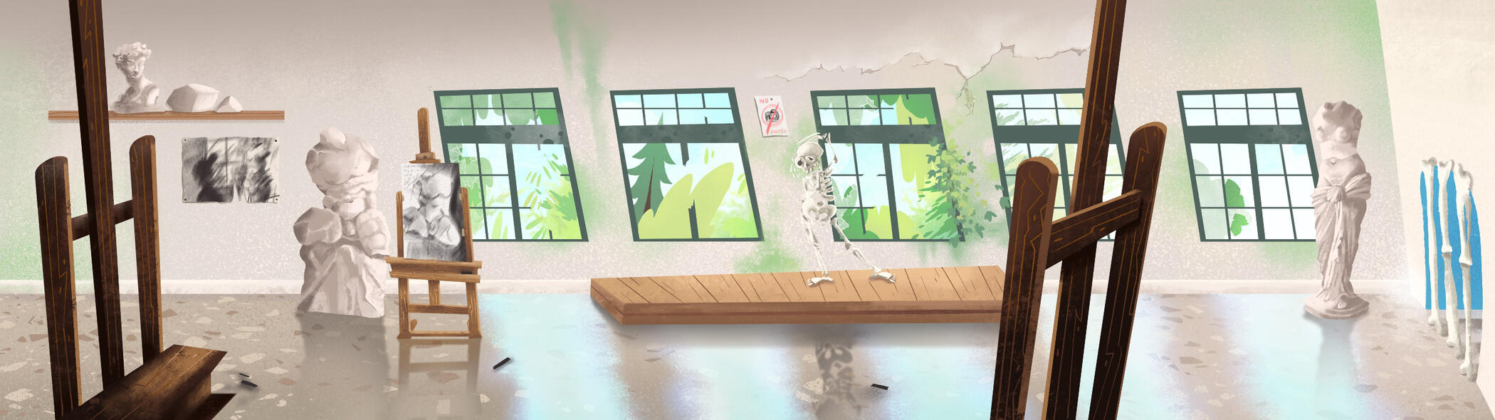 The Faculty (2023)Background design for a platform videogame set on my old Fine Arts university. I decided to base it on an alternate reality where a hundred years have passed and the human race has neared extinction. However, after a while, the Earth begins to heal and humans are trying to recover the remains of civilisation, including schools and universities.After so many years, all remains of any construction have suffered the passing of time, making exploration difficult. The strong climate changes, along with the toxic materials that have been lying around the campus since the beginning of time, are not a good combination AT ALL, so there are some abominable, mutant beings out there waiting to eat us, like anatomy models that have come to life!
